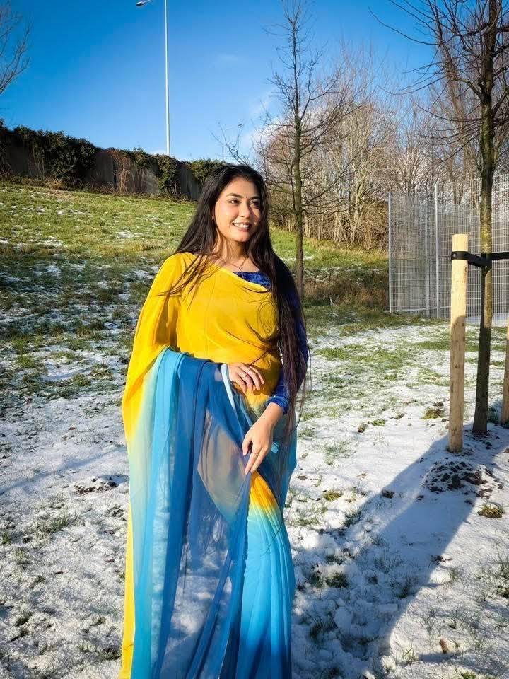 Add a touch of freshness and elegance to your wardrobe with this Rainbow Georgette Saree, designed for women who love a soft, graceful, and classy look. The saree features a beautiful all-over sunflower floral print that gives a bright and cheerful appearance, perfect for day wear and special occasions.